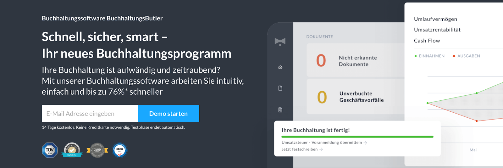 Die Buchhaltungssoftware Buchhaltungsbutler verspricht kleinen Unternehmen, ihre Buchhaltungspflichten bis zu 76 % schneller zu erledigen und rund 631€ pro Monat einzusparen.