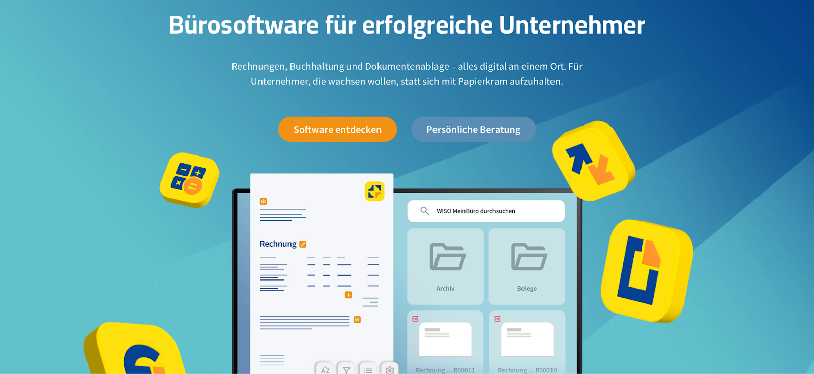 Mit WISO MeinBüro können Sie Rechnungen in unter einer Minute schreiben, per Knopfdruck Belege sammeln, und sämtliche Bücher nahtlos an Ihre bzw. Ihren Steuerberater:in weiterleiten. All das ist bereits ab 9€ pro Monat möglich.