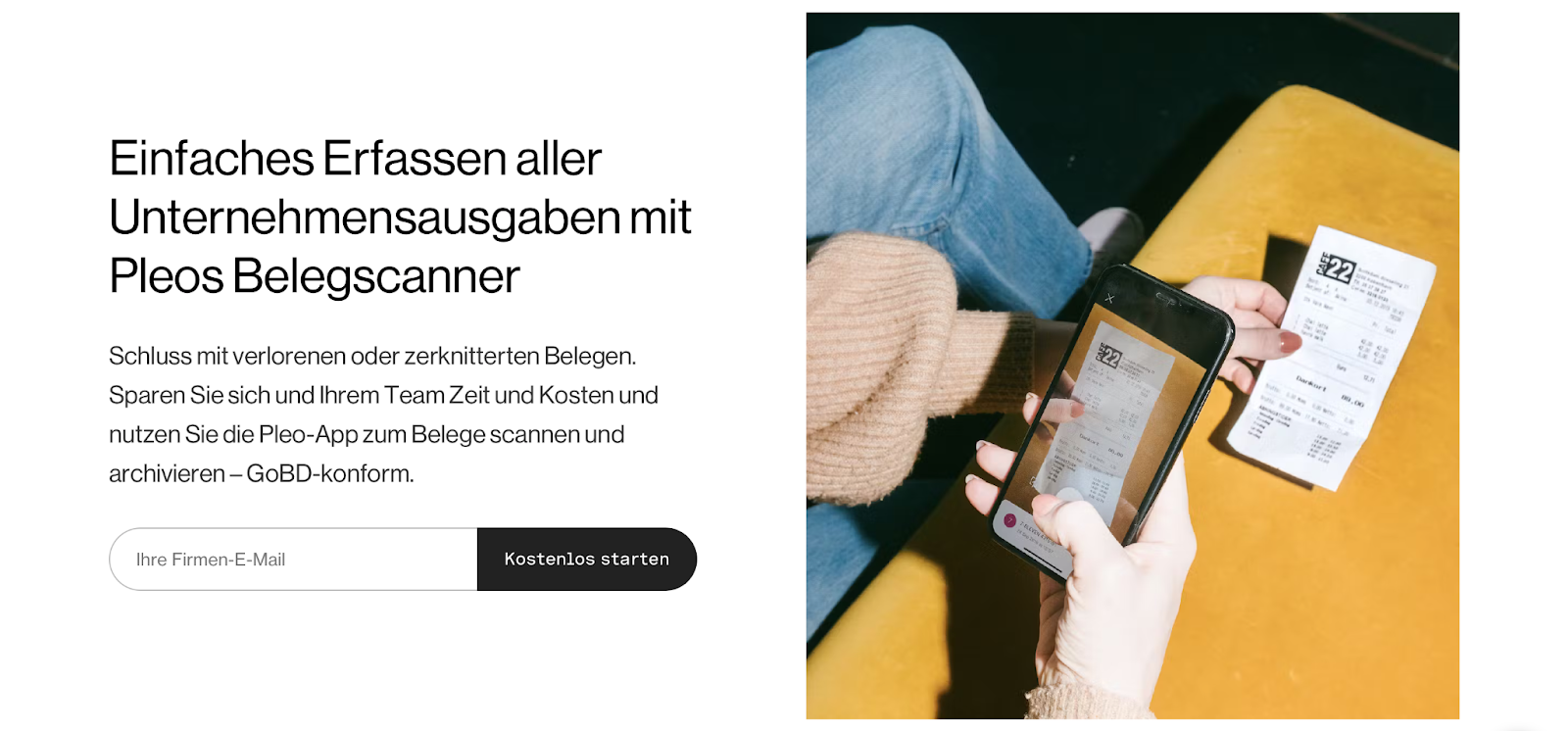 Der Pleo Belegscanner ist das beste maßgeschneiderte Tool für die Digitalisierung von Papierbelegen mit nur einem Knopfdruck. Die Belegscanner App von Pleo setzt auf fortschrittliche OCR-Technologie, um Belege auszulesen, speichert Belegdaten fehlerfrei digital ab und kontiert sämtliche Belege für reibungslose Rückerstattungen vor. Spesenmanagement könnte kaum einfacher sein.