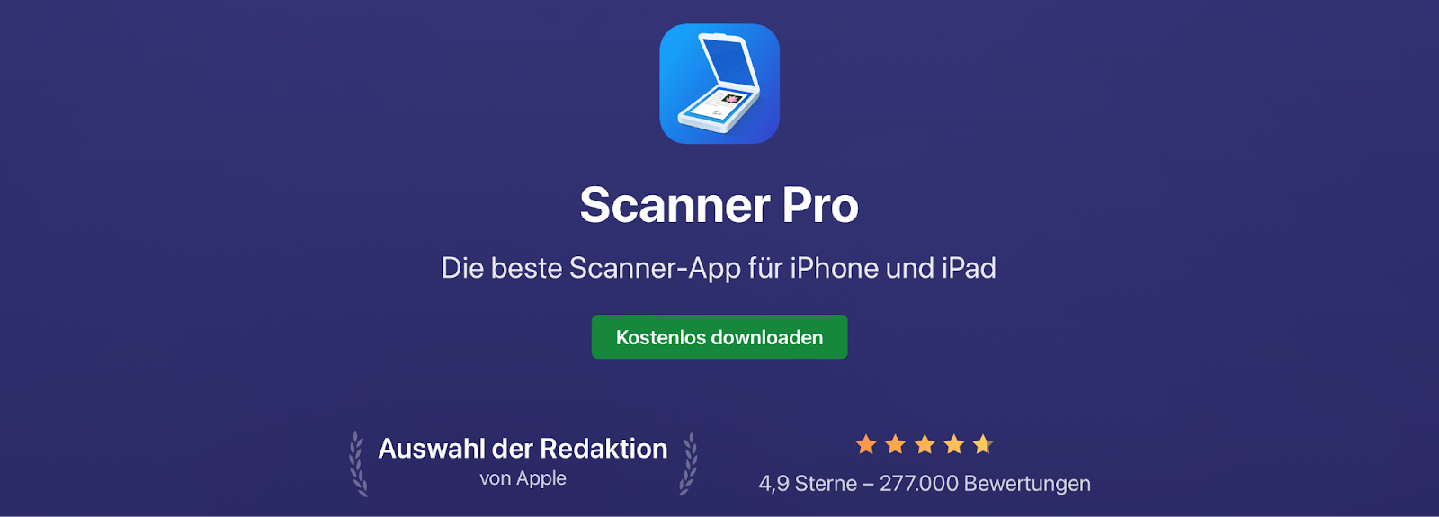Der Readdle Scanner Pro lobt sich mit einer starken Bewertung von 4,9 Sternen aus 277.000 Bewertungen als die beste Scanner App für iPhone und iPad. Die App ist intuitiv bedienbar und verwandelt Papierbelegen zuverlässig in hochwertige PDFs.