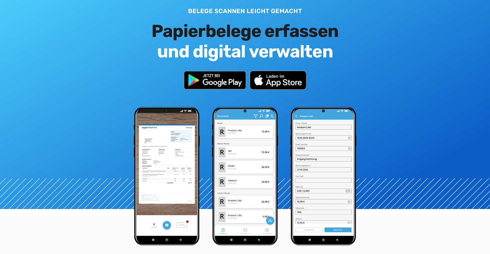 Ein Belegscanner ist eine mobile Applikation, die Ihnen erlaubt, Papierbelege wie z. B. Bewirtungsbelege, Quittungen, Dokumente und Rechnungen per Handy-Kamera zu scannen und in ein digitales Format umzuwandeln.