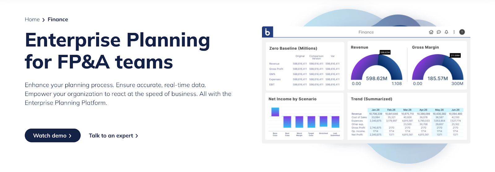 - Zahlreiche Planungsfunktionen für Finanzteams, z. B. Budgetierung, Szenarioplanung, Reporting und strategische Planung