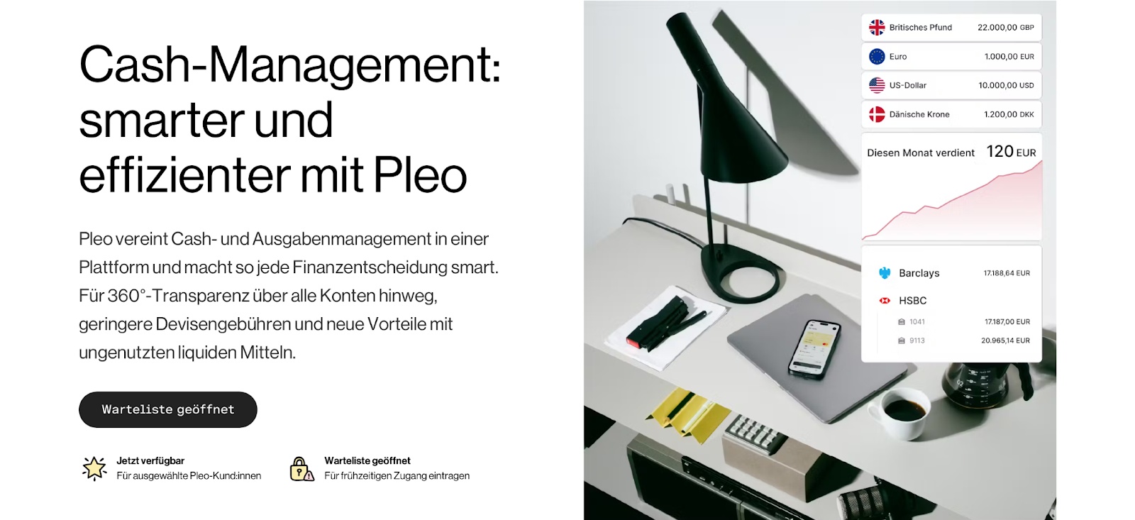 Erweitern Sie Ihren Software-Stack um die Pleo Cash-Management-Suite, um Ihr Cash smarter zu verwalten. Machen Sie sich nicht nur ein Bild von Ihren zukünftigen Ausgaben, sondern sparen Sie auch Gebühren beim Währungsumtausch und investieren Sie Ihre liquiden Mittel, um mehr aus Ihrem Cash zu machen. Die Pleo Cash-Management-Suite ist bereits für erste Nutzer verfügbar – tragen Sie sich in die Warteliste ein.