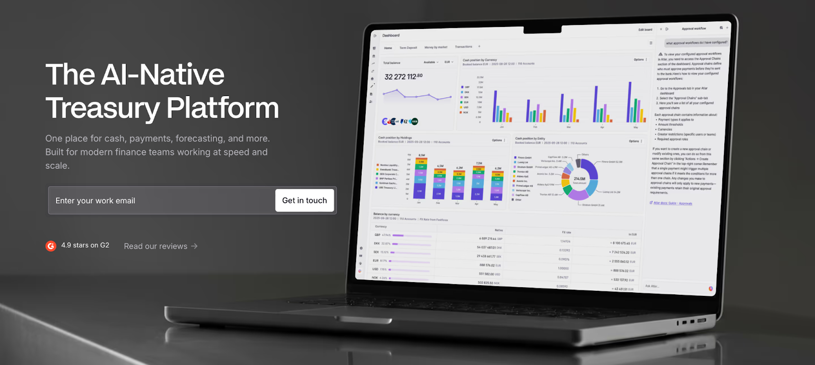 Nachdem bereits einige Anbieter in diesem Vergleich mit der Integration von neuartigen KI-Funktionen auf sich aufmerksam gemacht haben, ist Atlar nun die erste KI-native Lösung für Ihr Treasury- und Cashflow-Management. Das bedeutet: Atlar bietet eine KI-betriebene Oberfläche für Cash Management, Zahlungen, Cash Forecasting und Investitionen, deren Automatisierungsgrad seinesgleichen sucht.