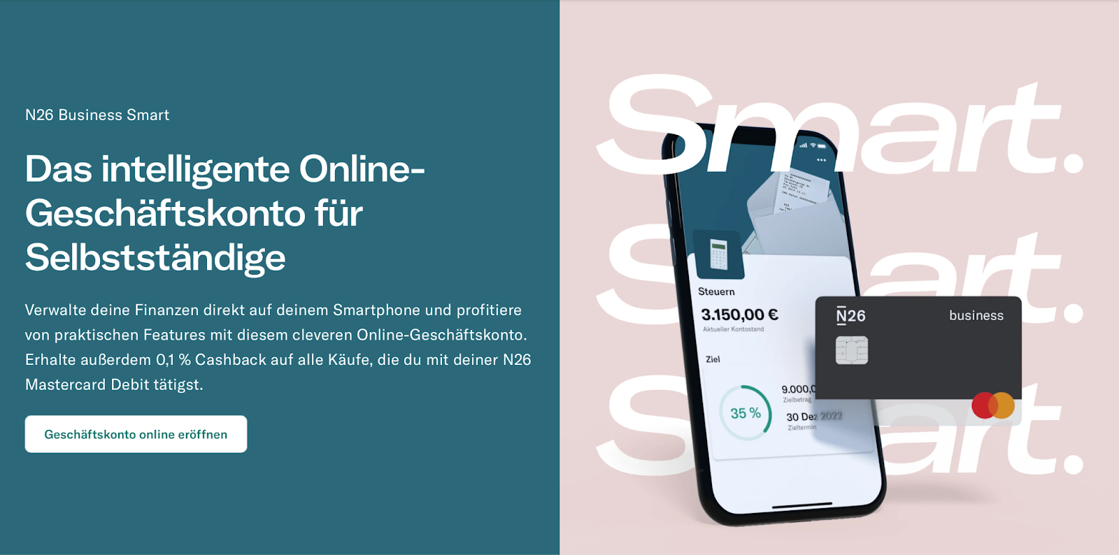 Die Neo-Bank N26 liefert mit der N26 Business Smart eine flexible Firmenkarten-Lösung für Selbstständige. N26 Business Smart besteht aus einer virtuellen Mastercard Debitkarte, die Sie auch in physischer Form ausstellen lassen können, und einer intuitiven App-Oberfläche für die Verwaltung Ihrer geschäftlichen Ausgaben.