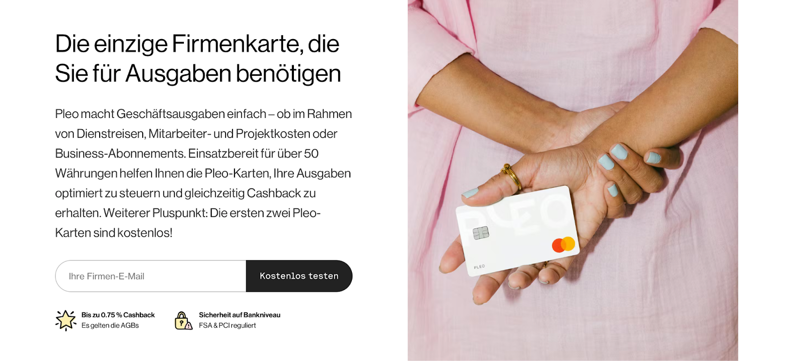 Setzen Sie auf Pleo Firmenkarten, um Ihre Geschäftsausgaben einfach zu decken und effizient zu verwalten. Mit Pleo Firmenkarten können Sie in über 50 Währungen bezahlen und erhalten dabei noch bis zu 0,75 % Cashback. Dazu können Sie, wann immer nötig, innerhalb von wenigen Minuten eine neue Firmenkarte erstellen und einrichten. Und das Beste daran? Sie können Pleo komplett kostenlos testen.