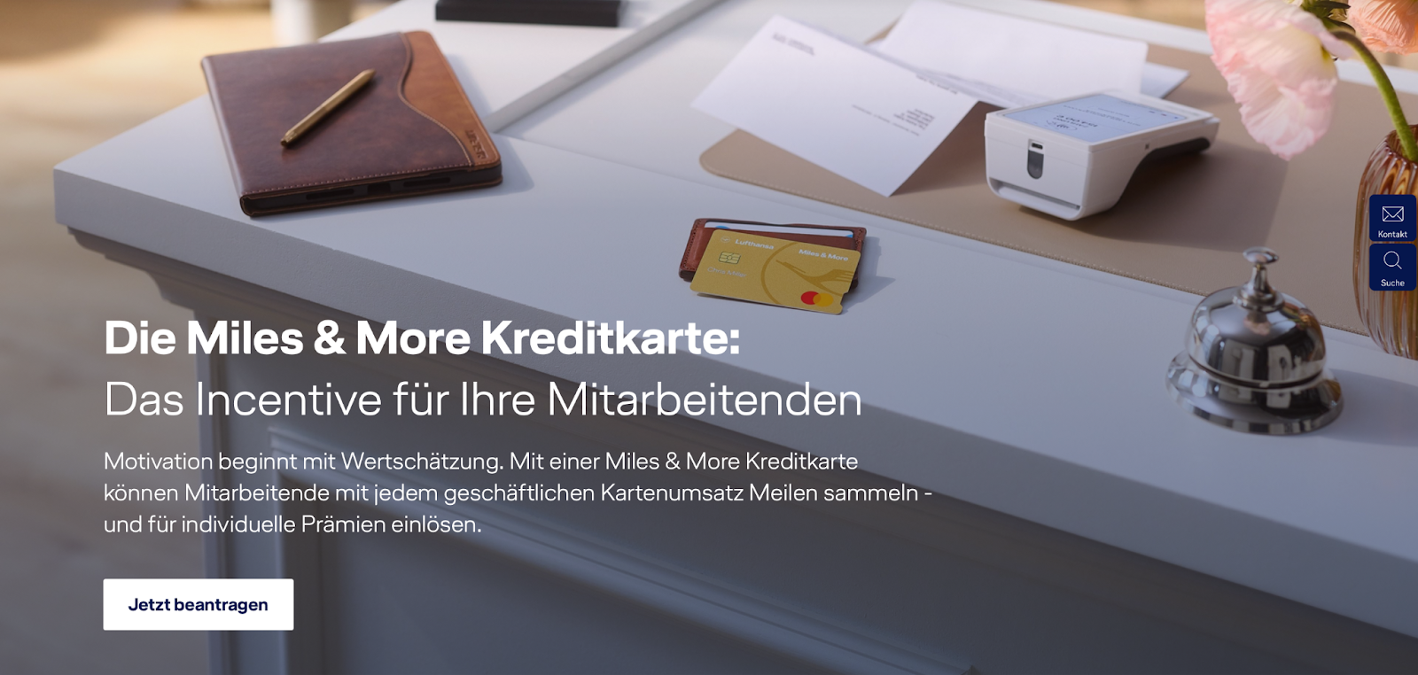 Stellen Sie Ihre Firmenkarten in erster Linie für Geschäftsreisende aus, sollten Sie die Anschaffung einer Miles & More Kreditkarte in Betracht ziehen. Diese physische Firmenkarte ist speziell für Geschäftsreisen ausgestellt und bietet zahlreiche Benefits für Flug- und Hotelbuchungen, wie z. B. Flugmeilen und Points sowie Versicherungen und weitere Reiseservices.