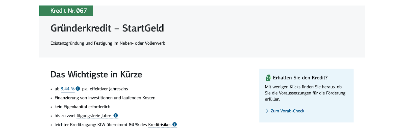 Deutsche Geschäftskredite für Existenzgründer werden in den meisten Fällen durch die KfW bereitgestellt. Die Gründerkredite der KfW, kurz für Kreditanstalt für Wiederaufbau, können Sie über Ihre Hausbank, aber auch direkt bei der KfW beantragen. Das “Startgeld” ist etwa für Investitionen und laufende Kosten vorgesehen und sichert Ihnen bis zu 125.000€ und zwei tilgungsfreie Jahre bei einem effektiven Jahreszins von 3,44 % zu. Eigenkapital ist für diesen Kredit für Existenzgründer nicht erforderlich.