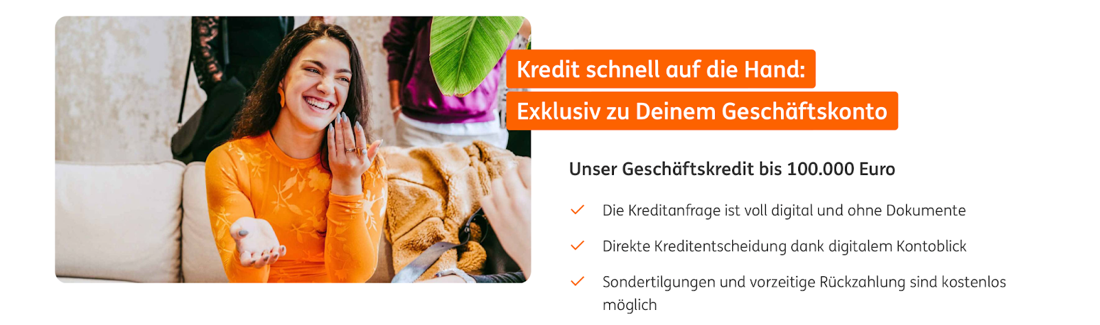 Die ING Bank bietet Geschäftskredite für selbstständige Freiberufler mit einem ING Geschäftskonto an. Diese können unkompliziert online über Ihr Geschäftskonto beantragt werden. Geben Sie Ihren gewünschten Kreditbetrag und die Laufzeit an und erfahren Sie dank der direkten Bonitätsprüfung sofort die Kreditentscheidung. Genehmigte Geschäftskredite werden auf das Geschäftskonto ausgezahlt und umfassen bis zu 100.000€. Sondertilgungen und vorzeitige Rückzahlungen sind laut ING ebenfalls kostenlos möglich.
