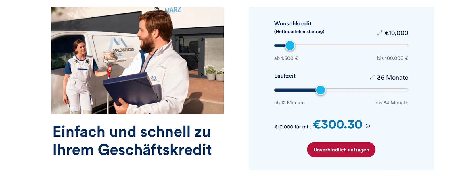 Die Targobank bietet flexible Optionen für Geschäftskunden, die auf der Suche nach Finanzierungsoptionen sind. Die Geschäftskredite der Targobank sind für Laufzeiten von 12 bis 84 Monaten verfügbar und können bis zu 100.000€ umfassen. Der effektive Jahreszins für Ihren Geschäftskredit bewegt sich zwischen 4,99 % und 10,95 %, je nach Kreditentscheidung der Targobank. Die Kreditanfrage erfolgt über die offizielle Website der Bank; die Kreditentscheidung erfolgt nach Angaben der Bank schnell.