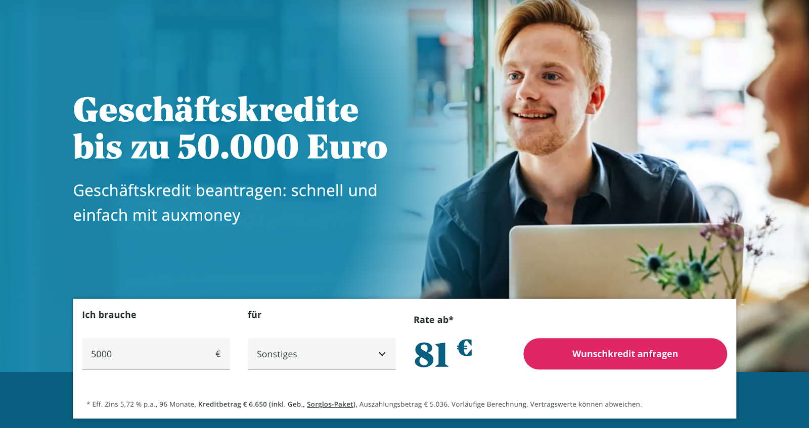 Die Crowdlending-Plattform Auxmoney bietet eine attraktive Alternative für die Kreditaufnahme zum klassischen Gang zur Bank. Bei Auxmoney stellen Sie Ihre Kreditanfrage auf einem Online-Marktplatz und sichern sich Ihre Finanzierung von privaten Anlegern. Die Geschäftskredite ohne Eigenkapital von Auxmoney beginnen schon bei 1.000€ und umfassen bis zu 50.000€, haben eine Laufzeit von bis zu 84 Monaten und bieten flexible Tilgungsoptionen. Der effektive Jahreszins bei Auxmoney beträgt 5,71 %.