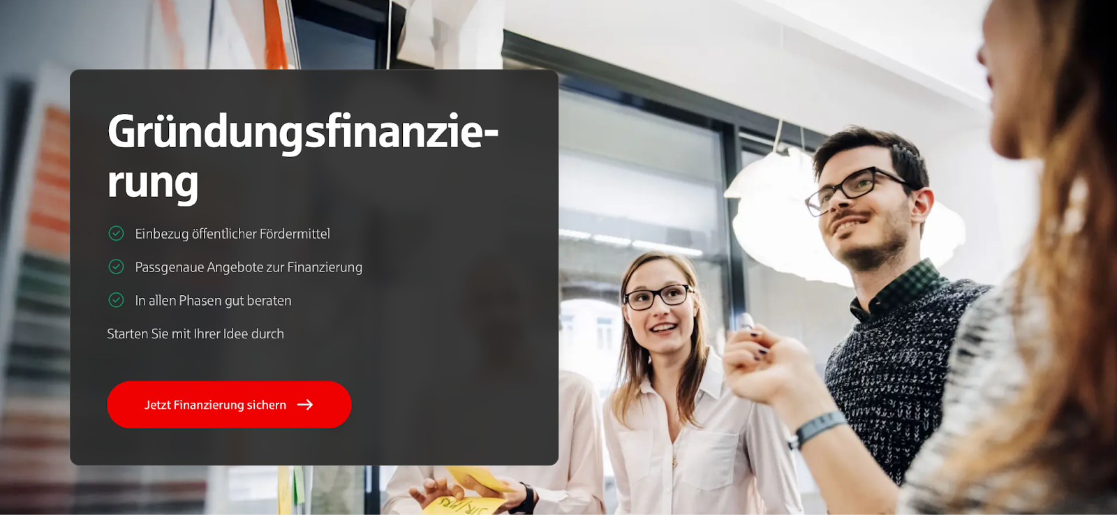 Die Gründungsfinanzierung der Sparkasse ist Ihr Schlüssel zu den öffentlichen Fördermitteln der KfW. Gründerkredite, auf die Sie sich bewerben können, sind der ERP-Gründerkredit “Startgeld”, der ERP-Förderkredit “Gründung und Nachfolge” und der ERP-Förderkedit “KMU”. Die Beantragung über die Sparkasse sichert Ihnen eine professionelle Beratung durch die Bank, Hilfe bei der Erstellung eines Businessplans und wichtiges Eigenkapital durch die Beteiligungsgesellschaften der Sparkassen-Finanzgruppe.