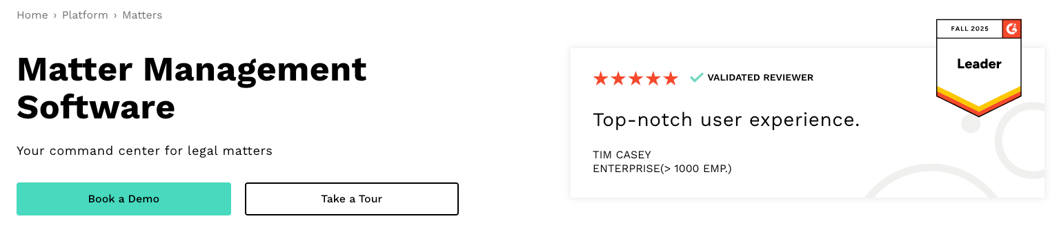 Brightflag earns its spot on the list for going beyond traditional matter management: it combines matter management with powerful spend analytics, giving legal teams clarity on both workload and cost.