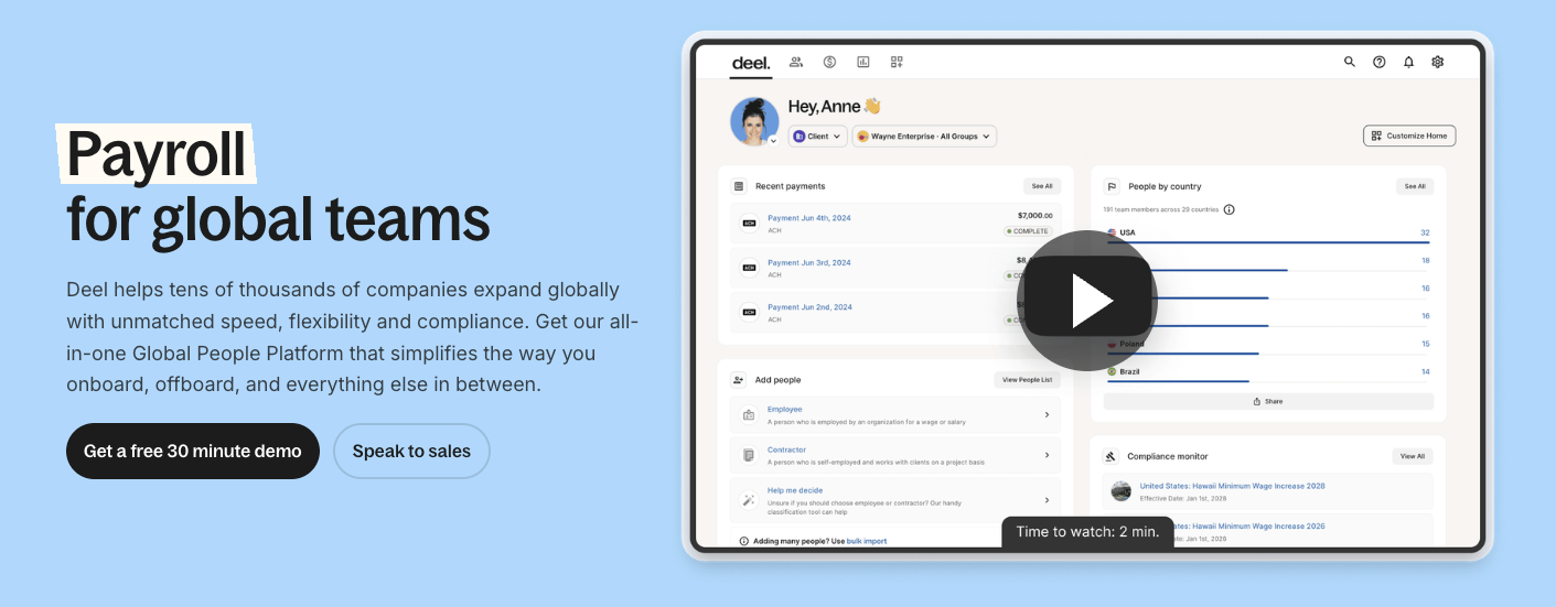 Deel takes the complexity out of paying and managing people – whether they’re employees or contractors, and whether they’re across town or across the globe. It handles everything from payroll and compliance to onboarding and reimbursements, so small businesses can build flexible, global teams without the admin headache.