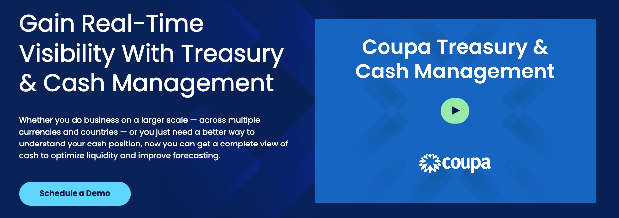 Part of the Coupa Business Spend Management suite, Coupa Treasury centralises cash, payments and liquidity data to give CFOs a clear, global view.