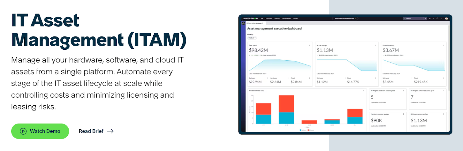ServiceNow ITAM offers enterprise-grade visibility into every tech asset you own – hardware, software, cloud and beyond. It automates the full asset lifecycle, from procurement to retirement, whilst helping you stay compliant with licensing and reduce unused inventory.