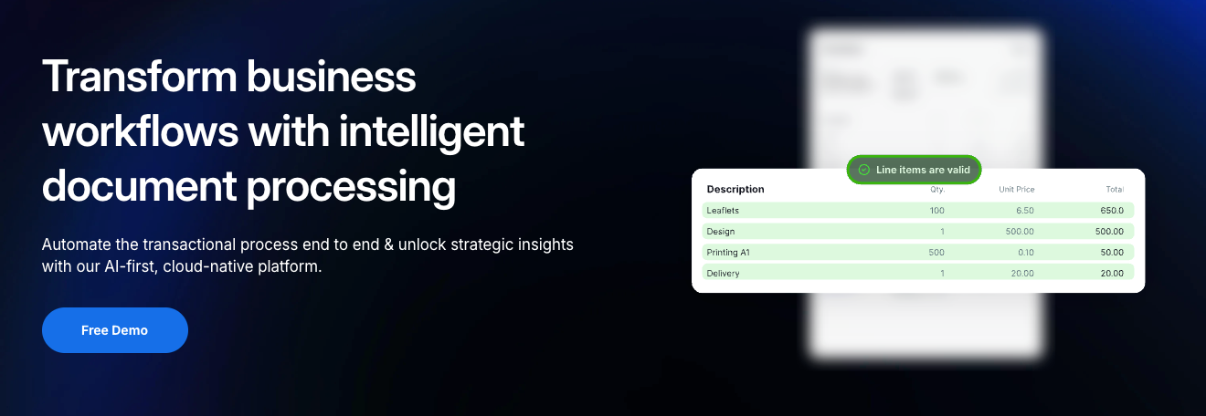 - AI-powered data extraction: Reads invoices of all shapes, layouts and formats without relying on strict templates.